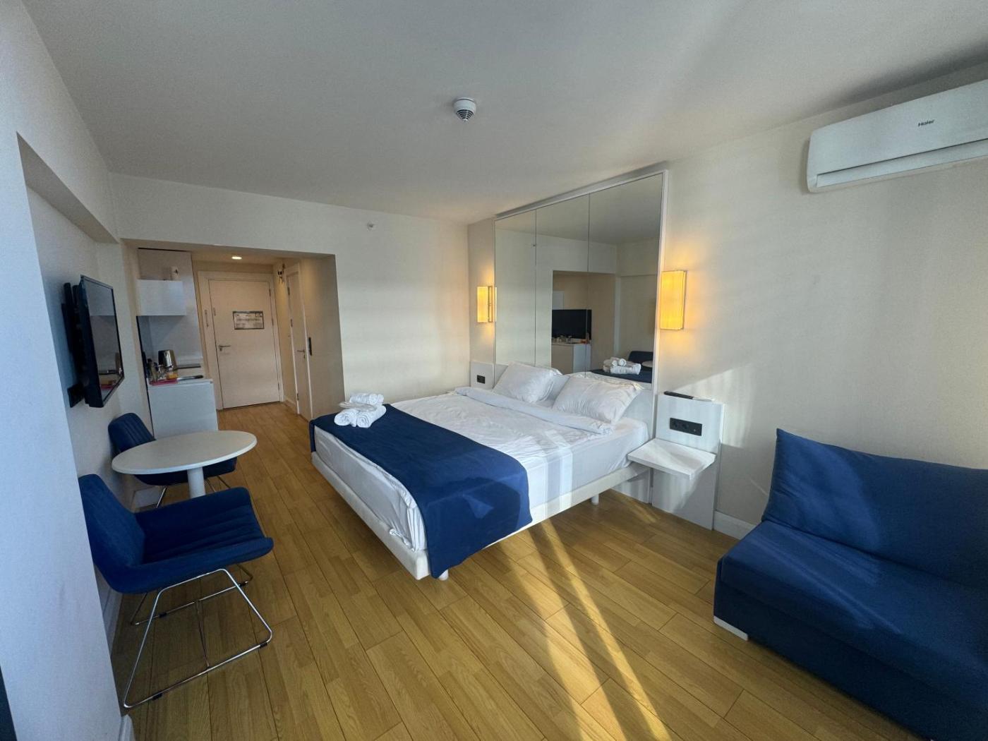 Studio Apartment with Sea View. This air-conditioned apartment is comprised of 1 living room, 1 separate bedroom and 1 bathroom with a shower. The well-equipped kitchenette features a refrigerator, kitchenware and an electric kettle. The apartment offers a flat-screen TV with cable channels, a washing machine, soundproof walls, a dining area as well as sea views. The unit offers 1 bed. ;