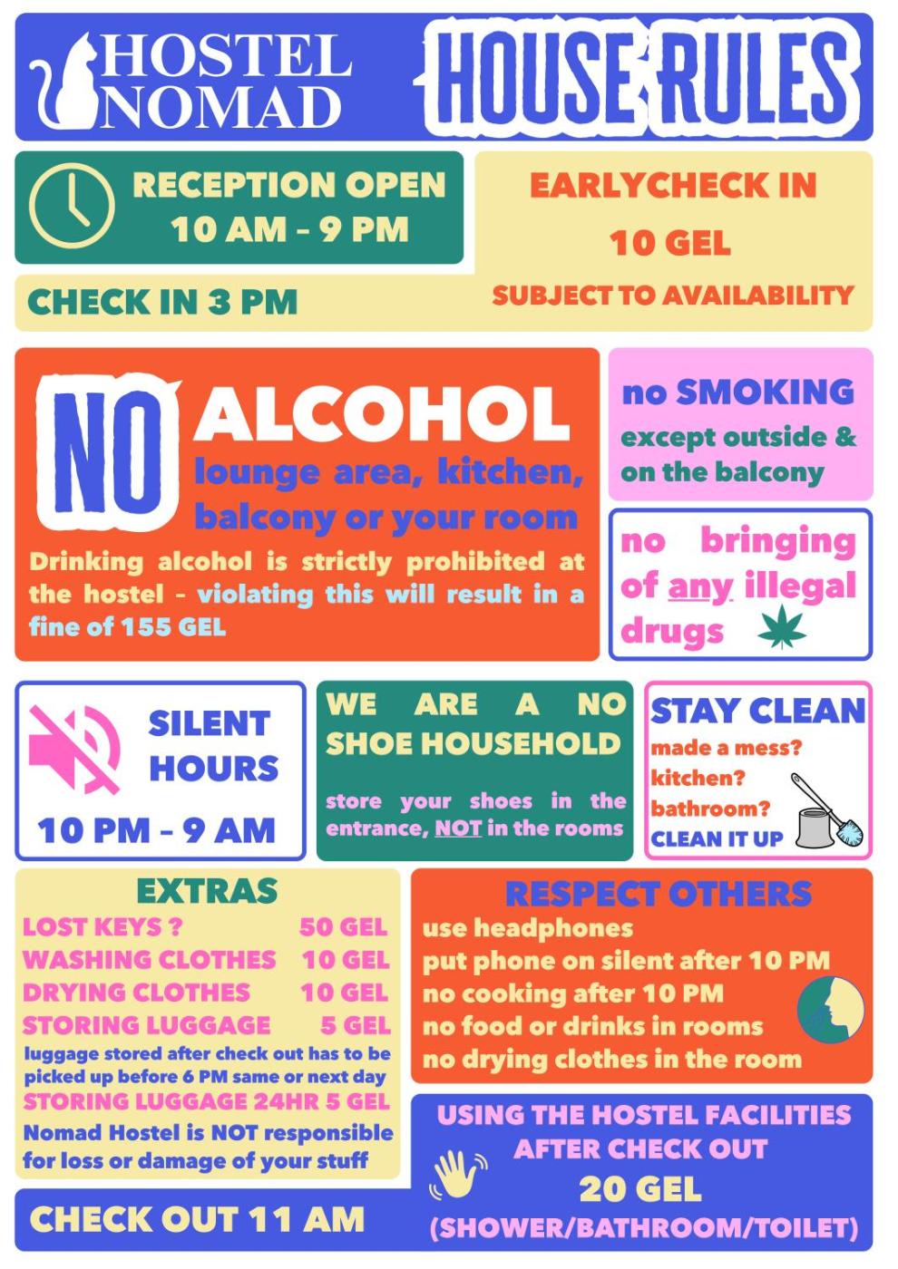 - Use of the hostel facilities after check-out will incur a charge of GEL 20